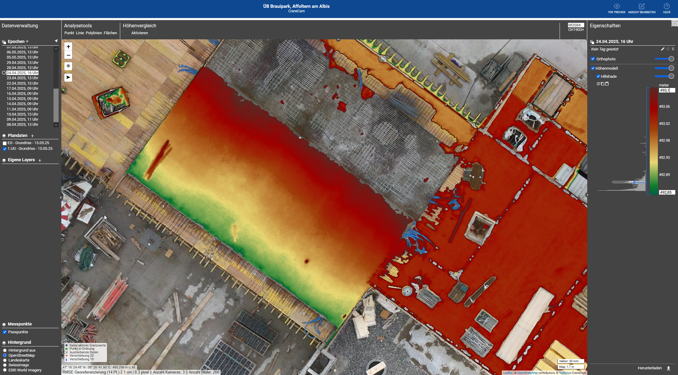 «Die CraneCam ist für uns eine absolute Erleichterung, da wir damit den aktuellen Stand jederzeit einsehen und Baustellenbesuche vor Ort reduzieren können. Zudem ermöglicht das Hinterlegen der Pläne die Überprüfung ihrer Richtigkeit, und die Einlagen können bequem mit dem Gefälle-Tool geprüft werden.»Nico Marti, Inhaber/Projekt- & Bauleiter, BAUWÄRCH Baumanagement