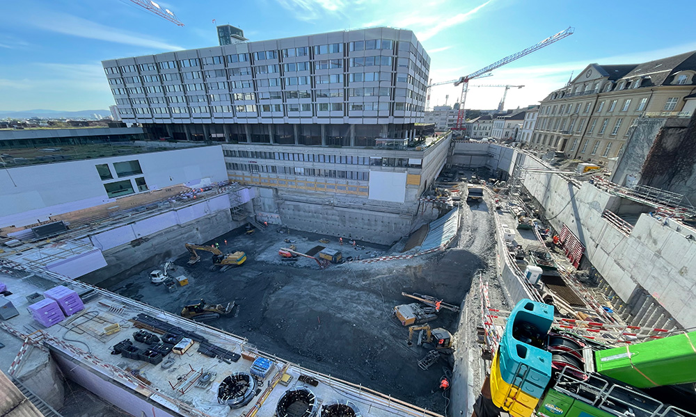 Die Baugrube für den benötigten Aushub von für 5 Untergeschosse liegt direkt zwischen dem Bestandsbau Klinikum K2 und dem denkmalgeschützten Markgräflerhof. Im Nordwesten schliesst die Baugrube an das Operationssaalgebäude OP-Ost und das MTA-Gebäude an. Aufgrund der tiefen Baugrube und in unmittelbarer Nähe stehenden Infrastruktur werden die Gebäude und die Baugrube selbst intensiv überwacht. Die Terradata erbringt diverse Dienstleistungen im Bereich der Mess-Sensorik, zusammen mit dem lokalen Monitoring-Partner Jermann Ingenieure+Geometer.