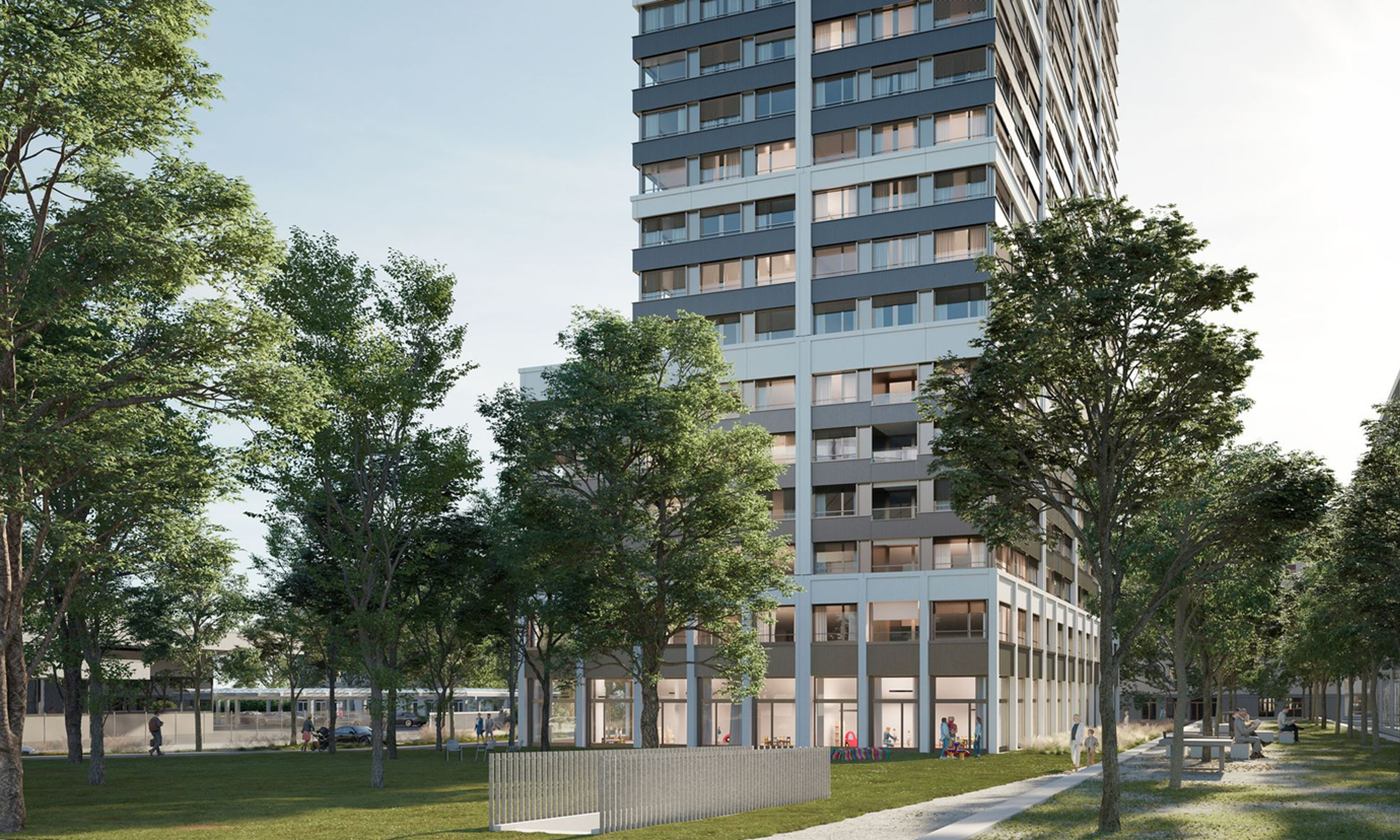 In Zürich-Leutschenbach entsteht ein markantes, 80 m hohes Wohnhochhaus mit 26 Etagen und 223 Mietwohnungen mit einem MIx aus 1.5 – 3.5 Zimmerwohnungen.