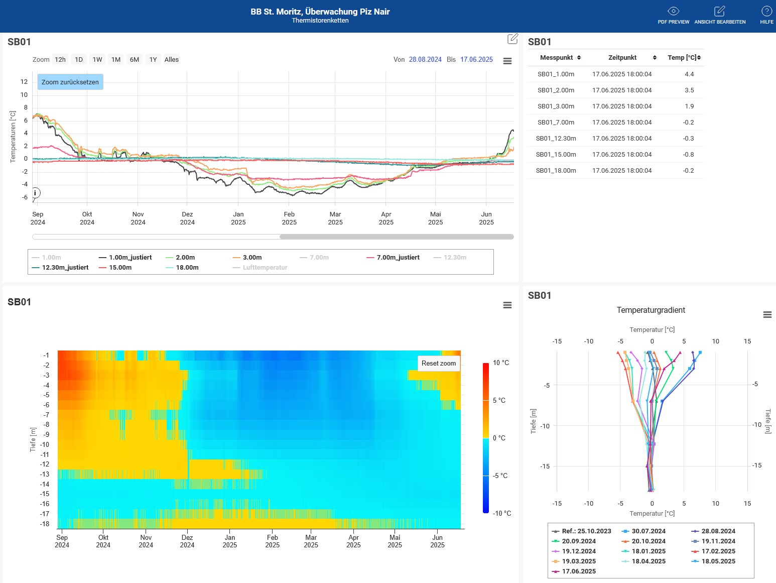Im 2024 hat die Grünenfelder und Partner AG diese Messsysteme übernommen, erweitert und führt seither auch die manuellen Überwachungsmessungen durch. Den Bergbahnbetreibern steht mit dem TEDAMOS Web eine Plattform zur Verfügung, in welcher sämtliche Messungen konsolidiert und einfach interpretierbar zur Verfügung stehen.
