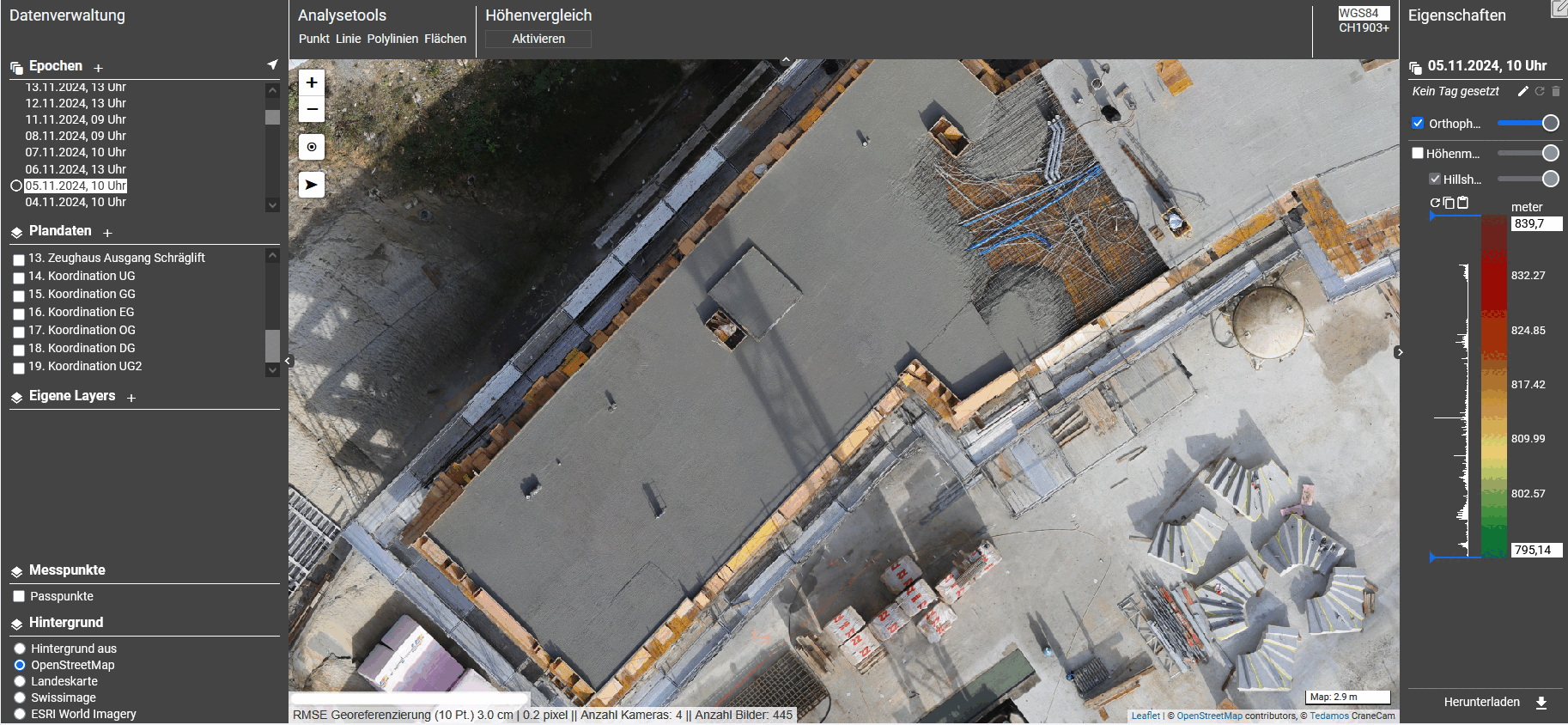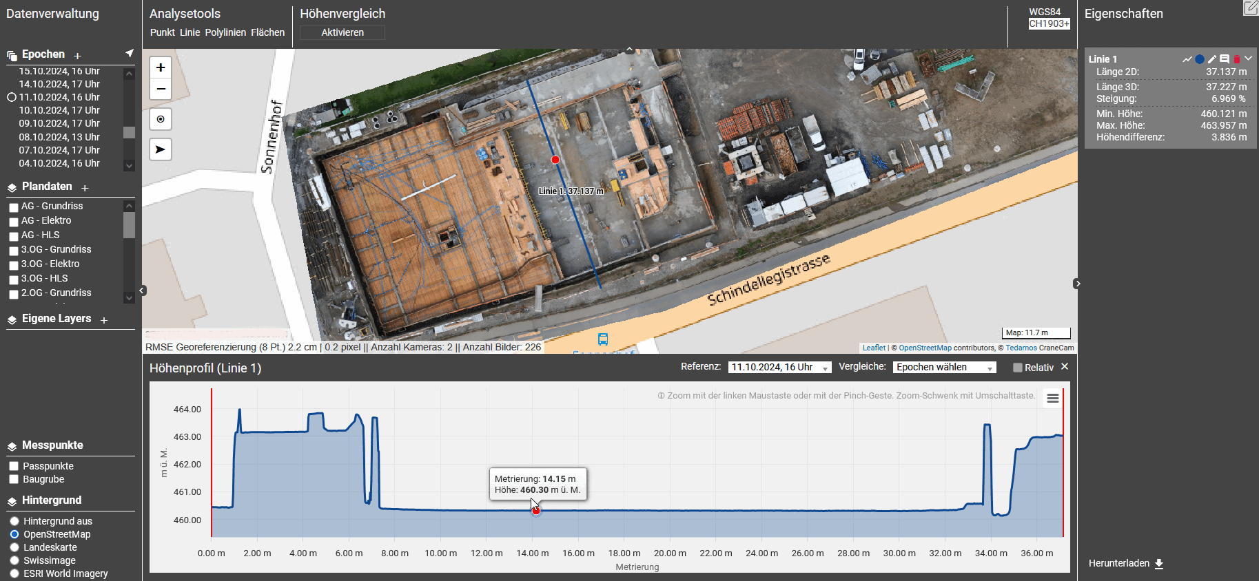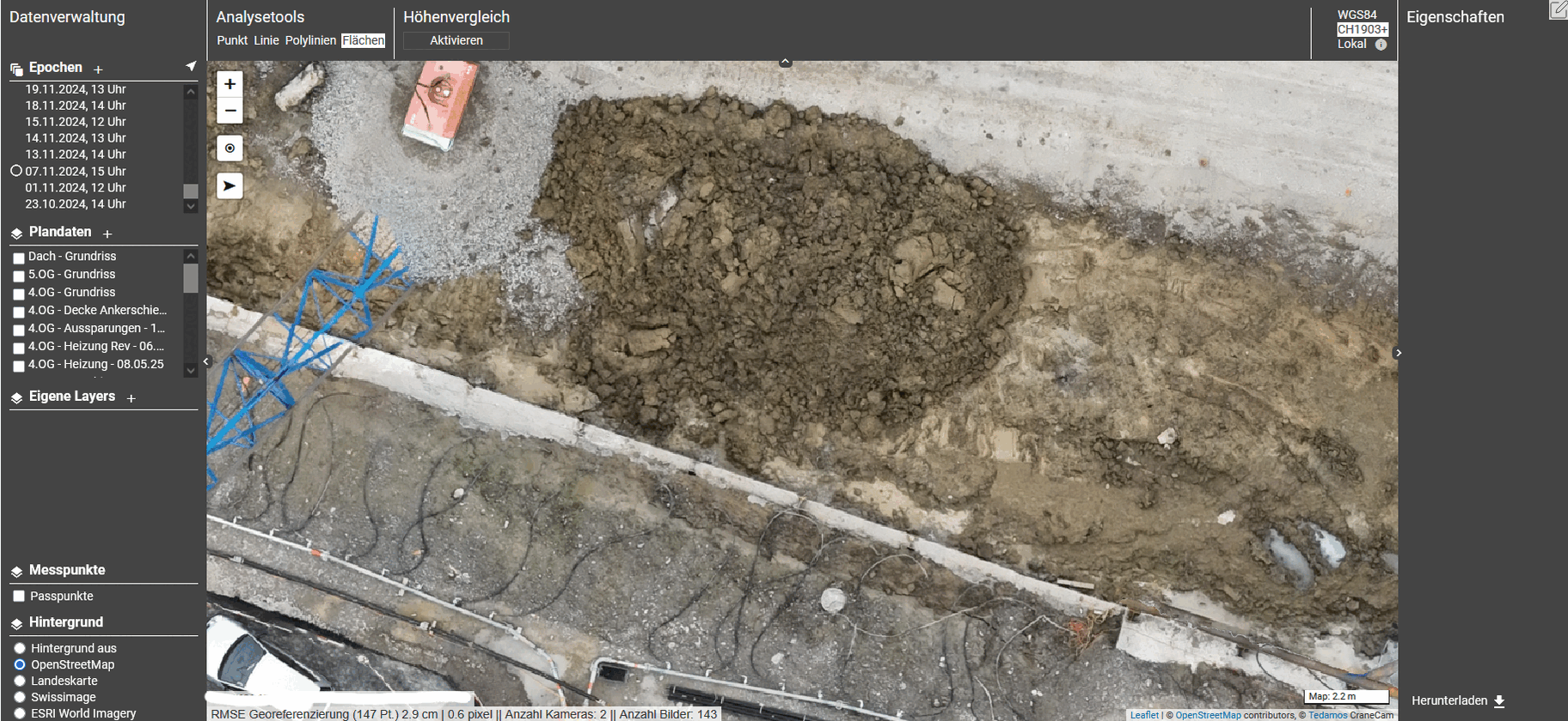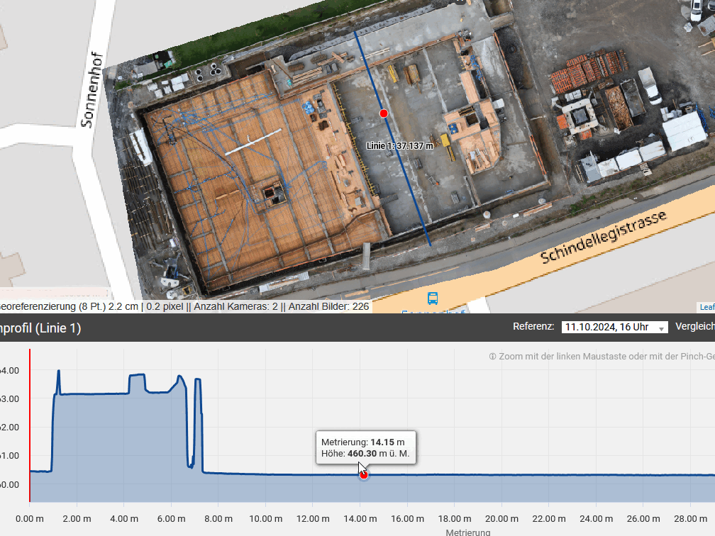 Vergleiche mit früheren Aufnahmen oder Referenzhöhen ermöglichen präzise Auskunft über Abtrag oder Auftrag - nützlich während des Tiefbau- / Aushubphase