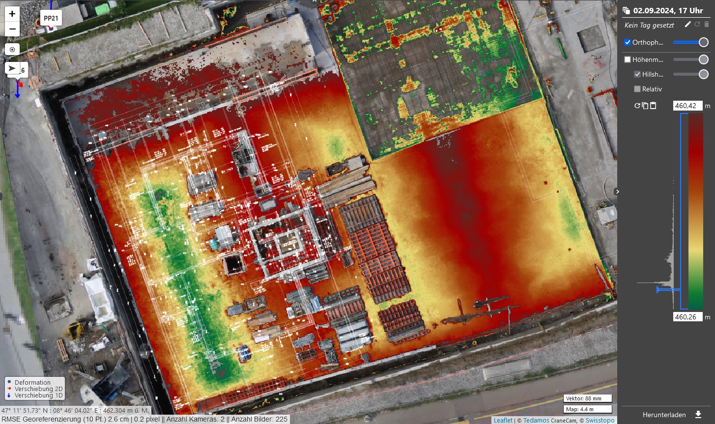 As a supplement and support for Ramensperger Generalunternehmung AG, the construction management company Markus Benz GmbH, and the contractors involved, excavation documentation was carried out using TEDAMOS DroneCam. During the first months of June–July 2024, the excavation work was documented weekly from the air. Since the start of the floor slabs with the first pipes, the entire construction site has been covered by CraneCam. This solution enables those involved to track the construction progress on a daily basis and document it automatically. It can also be used to calculate volumes for the target excavation pit or the original terrain, for example.