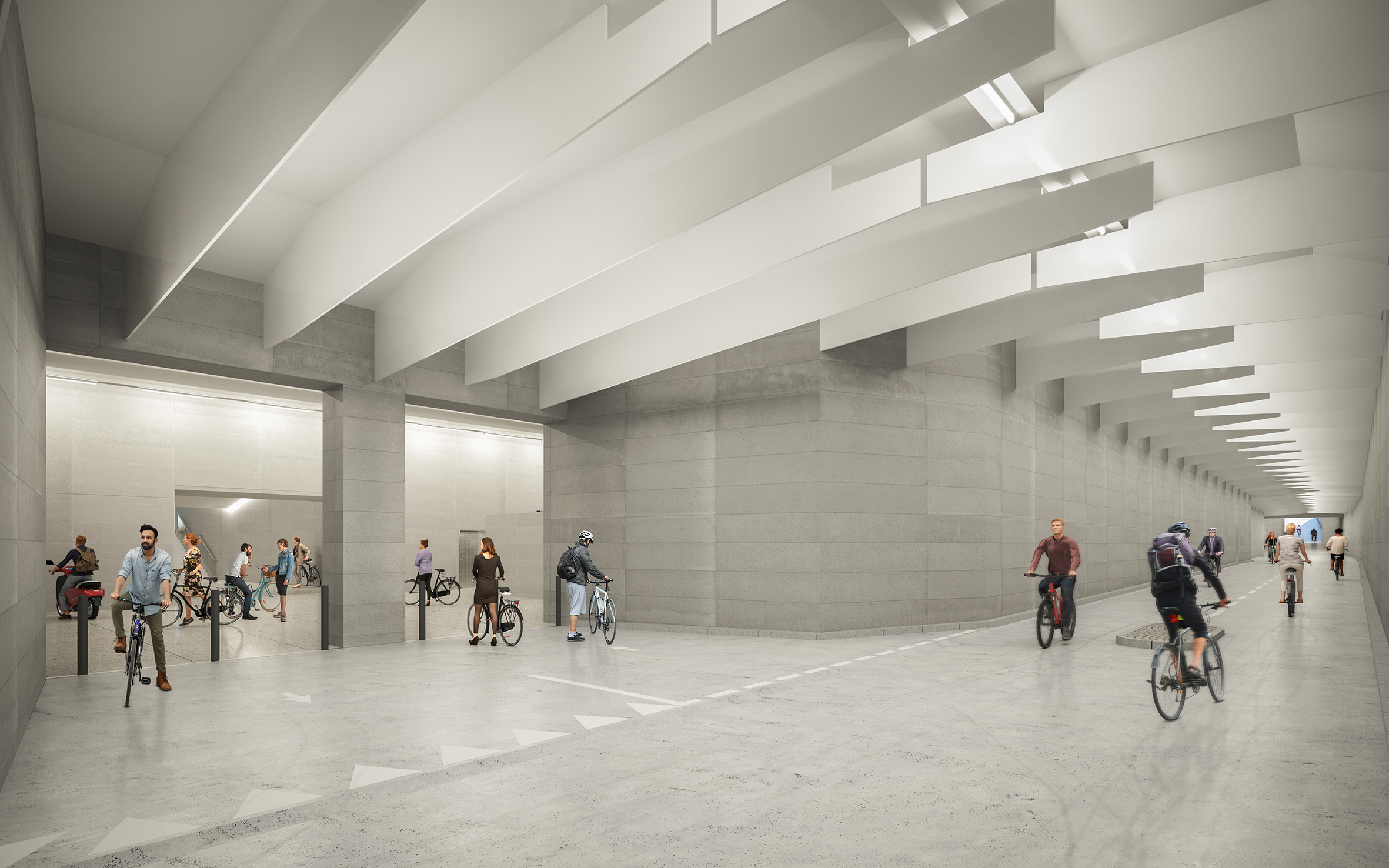 What was planned in the 1980s as a motorway link under Zurich's main station is being converted by the city of Zurich into a spacious, 320-meter-long bicycle tunnel and a bicycle station, with work scheduled to begin in September 2022. The work will continue until spring 2025 and the project costs amount to approximately CHF 39 million. Two ramps from the north and south sides of the station will provide access to an underground bicycle station for 1,200 bicycles, which will be free to use once operational.