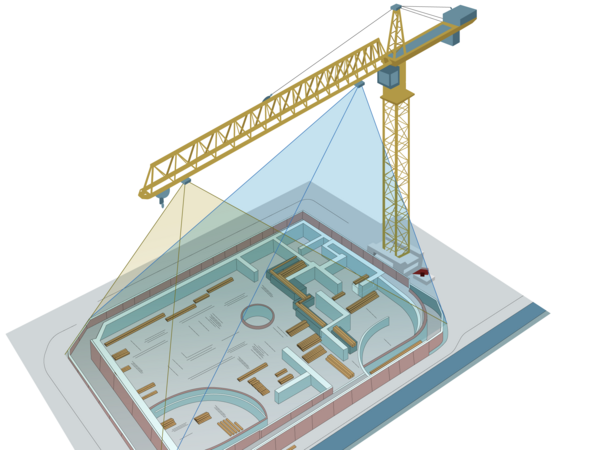 La première étape consiste à installer des caméras sur la flèche de la grue afin de couvrir la zone souhaitée. Pour les petits chantiers, deux caméras sur une grue suffisent. Pour les chantiers plus importants, il est possible de combiner autant de caméras que souhaité sur plusieurs grues. En outre, des points de repérage sont installés de manière fixe aux alentours du chantier afin d'assurer le géoréférencement.